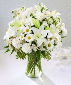 The innocence of a child is reflected in this arrangement of pure white flowers. All white carnations, alstroemeria, daisy and button poms and lilies are lovingly designed in a clear glass vase.