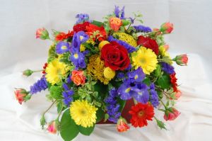 Oh boy, What a celebration! If you like color, lots of it and something to make a bold statement than this is the bouquet for you. I have designed this using Yellow Gerbera Daisies, Yellow Yarrow, Orange Mambo Spray Roses, Purple Tissue Statice, Blue Iris, Yellow Craspidia, Lime Green Buttons and finished it off with a punch of Red using My favorite, Longlasting Freedom Rose. This arrangement is full and just about perfect for any occasion.