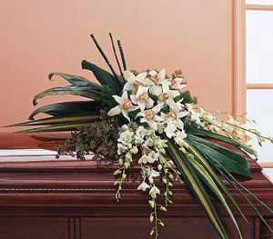 This exotic casket spray, with its two types of white orchids is simple and stunning.
