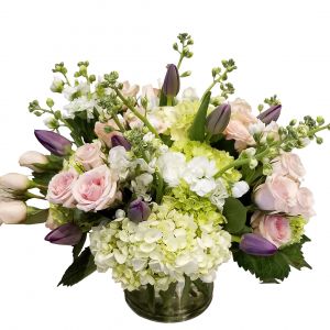 Glass Cylinder Vase is filled with White and Green Hydrangea, White Stock, Pink Spray Roses, and Purple Tulips.
