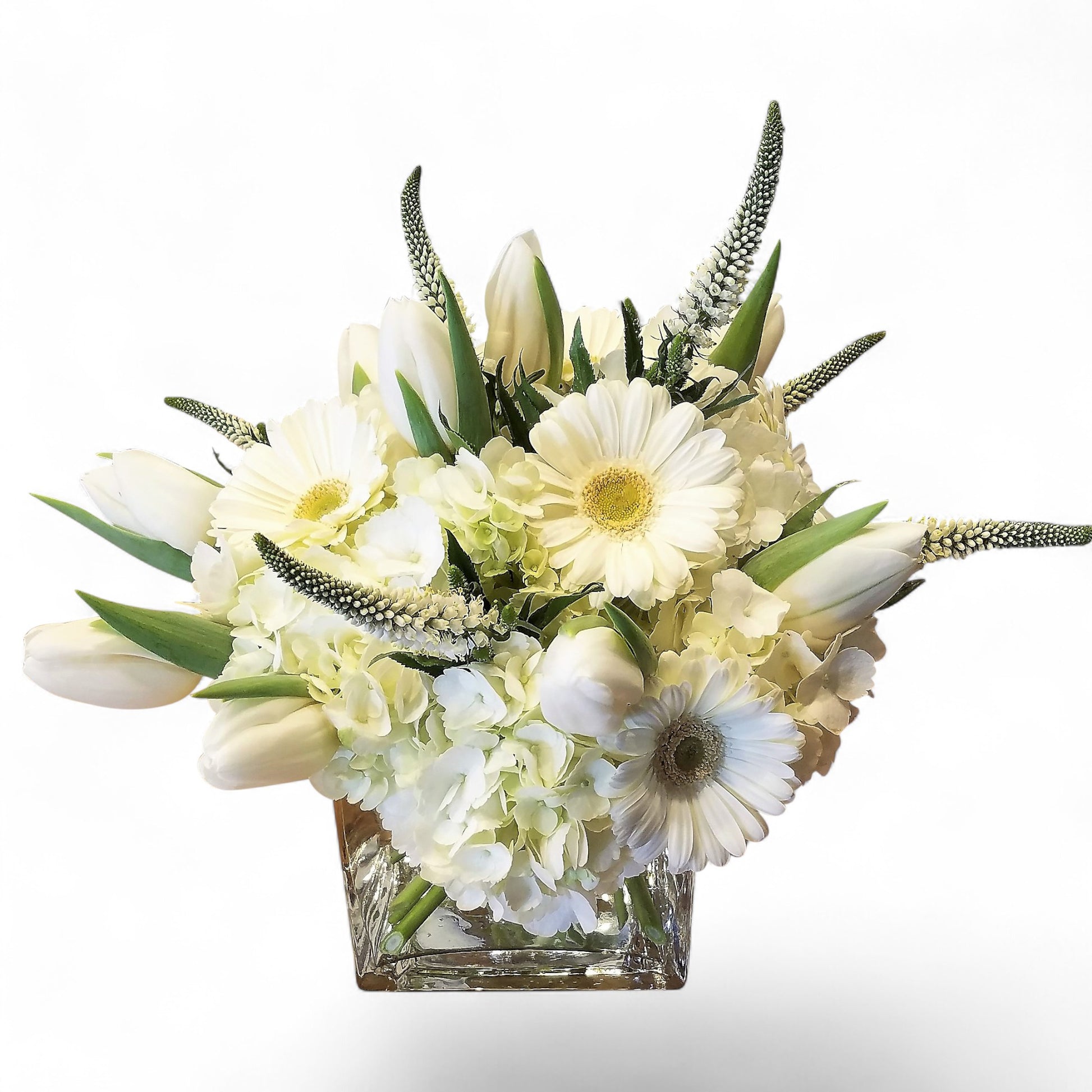 Mountain Top Meadow is a beautiful Elegant all white arrangement designed in a 5x5 glass cube vase mounded with White Hydrangea, White Tulips White Veronica and White Mini Gerberas. Appropriate for many occasions