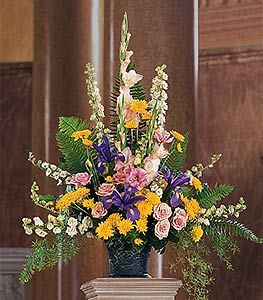 This lovely fan-shaped arrangement, with its soft traditional shapes, displays just the kind of loving tribute you want to send.