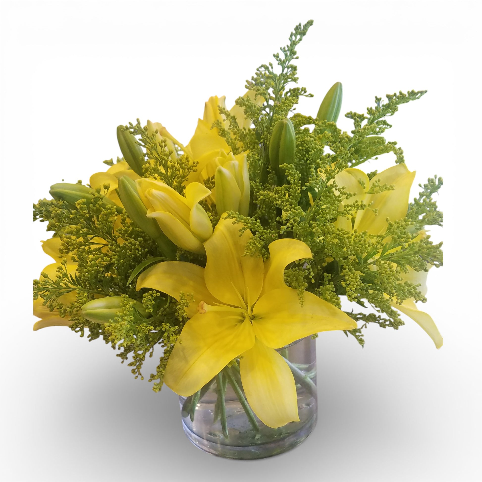 5X5 glass container designed using Yellow Lilies and Solidago.